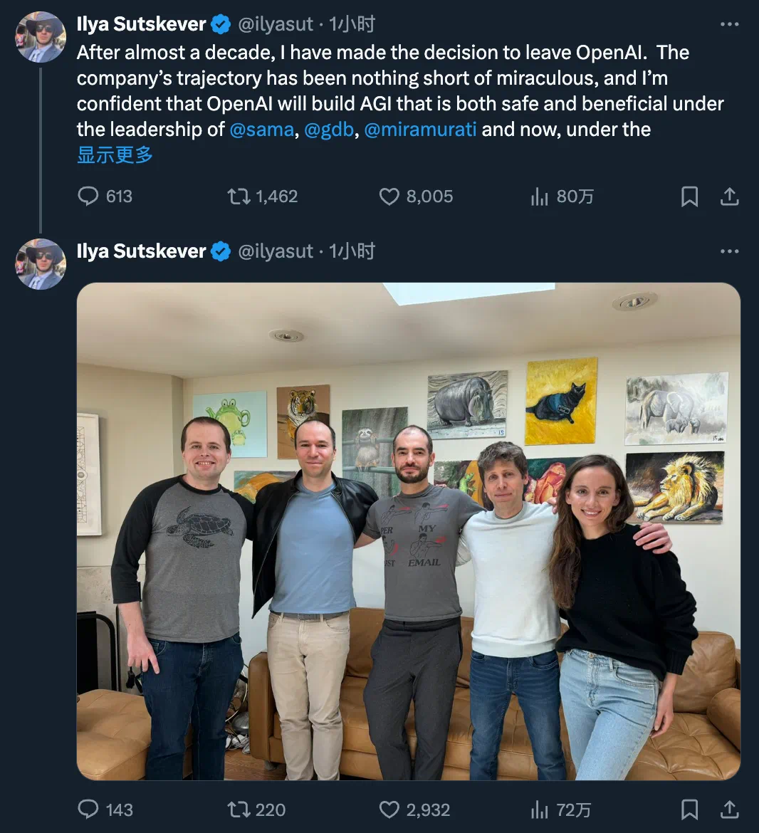 Ilya Sutskever还分享了与Sam Altman、Greg Brockman和Mira Murati等人的合照。