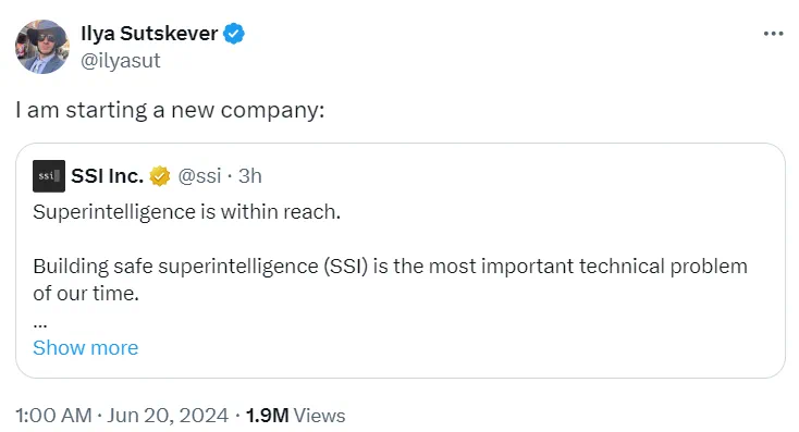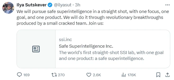 文章来源于互联网:突发!Ilya Sutskever成立新公司SSI,安全超级智能是唯一目标与产品