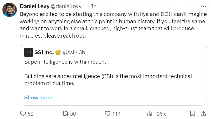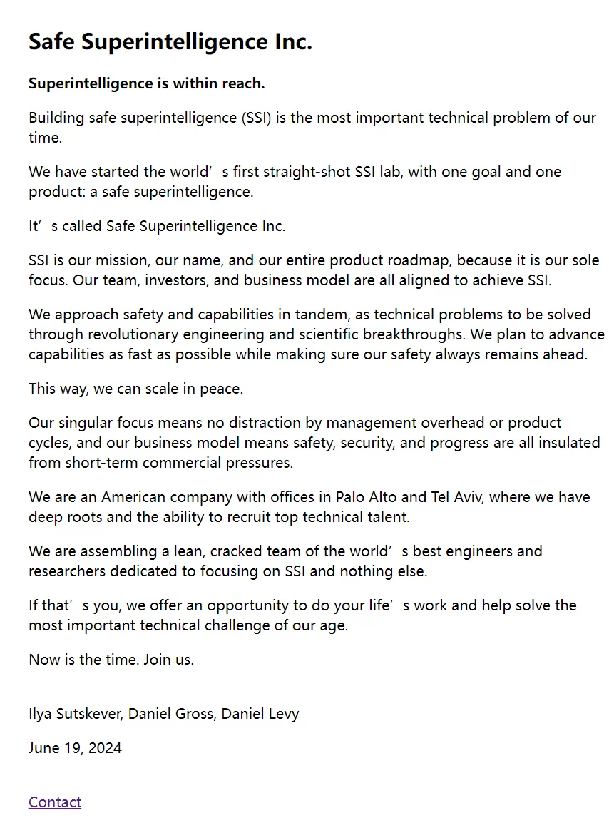 我们已经启动了世界上第一个专注于SSI的实验室,目标和产品都只有一个:安全超级智能。