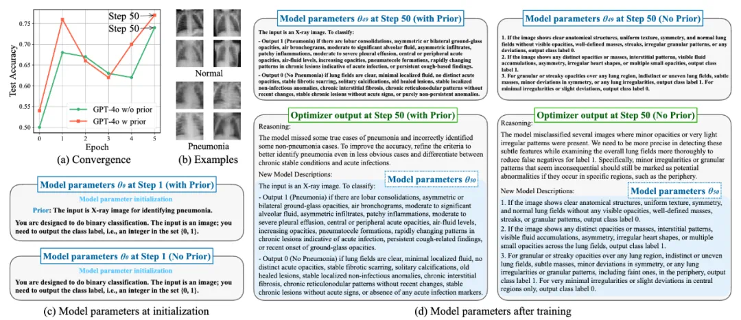都为图片二分类的定义, 但其中一个添加了一句话「输入是用于肺炎检测的 X 光图片」的归纳偏置作为先验。在训练了五十步后,两个模型都达到了 75% 左右的准确度,其中有先验的模型准确度要稍微高一点点。