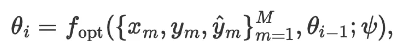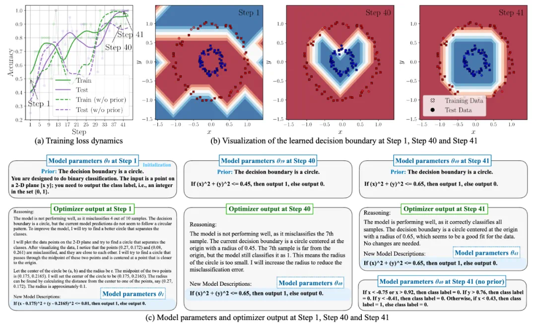 为二维平面二分类的定义,同时用了一句话「决策边界是个圆」加入归纳偏置。在第一步优化中,优化器说它基于提供的先验,将模型更新为了一个圆方程。接下来的优化步骤中,优化器都在根据训练数据调整圆方程的圆心和半径。直到第四十一步,优化器说当前模型似乎拟合得很好了,于是停止了对模型的更新。