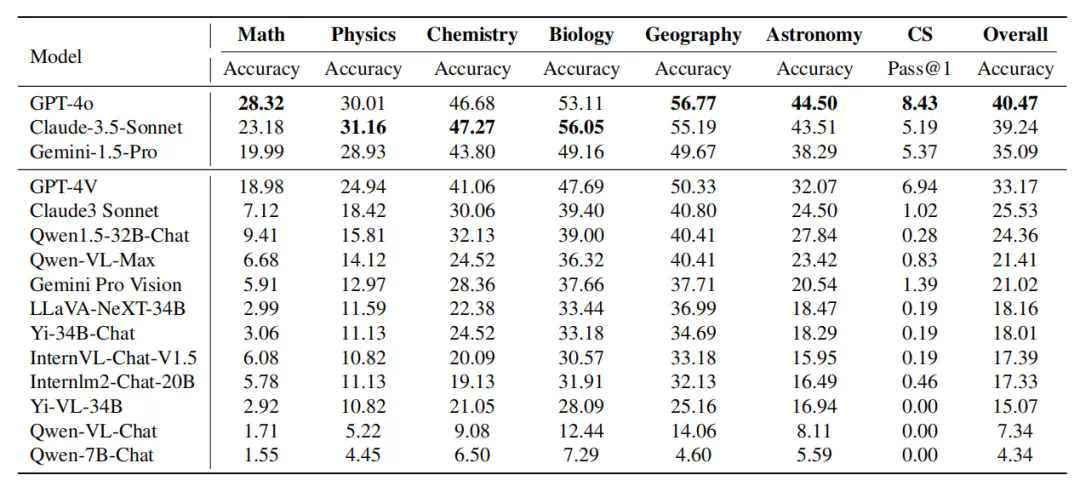 相反,当涉及到需要将知识与推理结合的学科,如物理、化学和生物学时,其他模型如Claude-3.5-Sonnet和Gemini-1.5-Pro展现出了具有竞争性的表现。这体现了不同模型的专业领域以及潜在的训练重点,表明在推理密集型任务以及知识整合型任务可能存在的权衡。