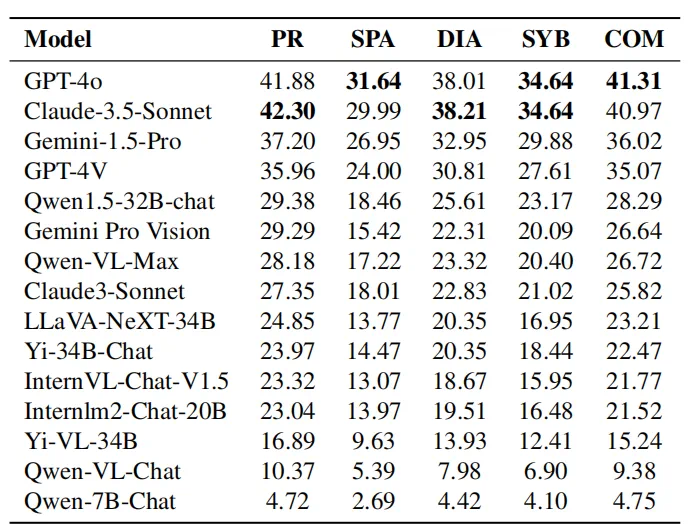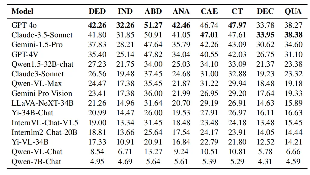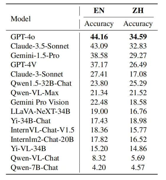 Gemini-1.5-Pro和GPT-4V排名紧随GPT-4o和Claude-3.5-Sonnet之后,但它们之间存在明显的表现差距。 -