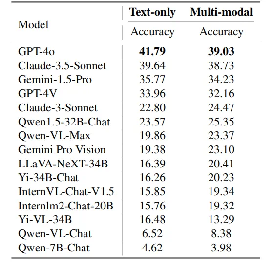 新发布的Claude-3.5-Sonnet性能强大,达到了几乎与GPT-4o相当的水平。两者的整体准确率差异仅约1%。 -