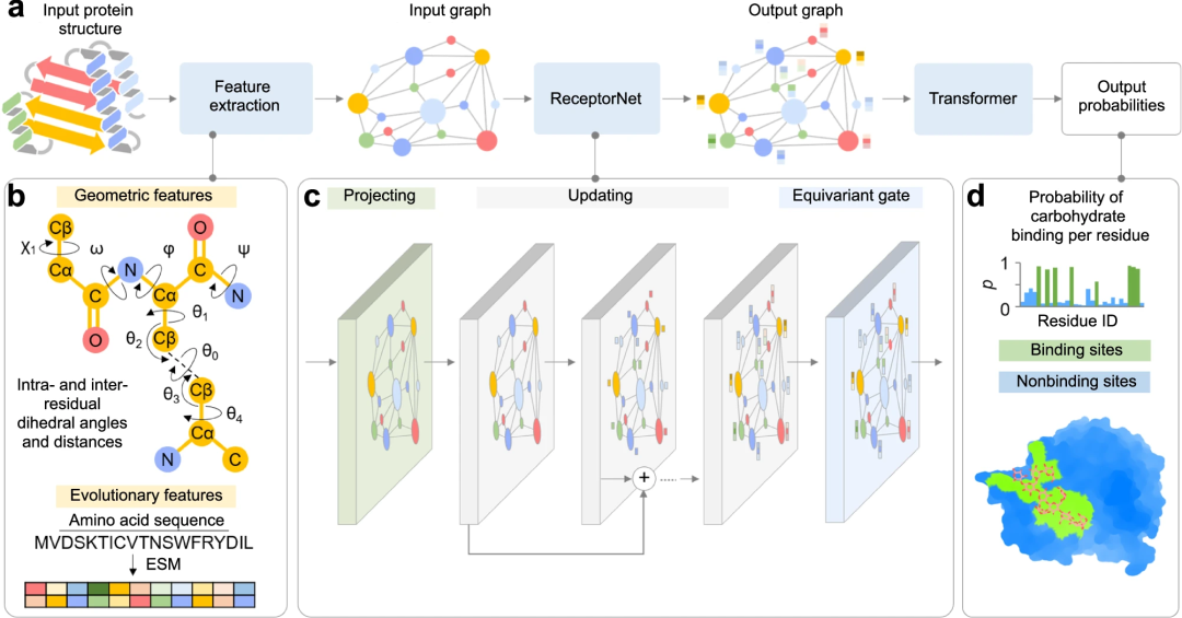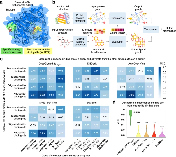 DeepGlycanSite 将蛋白质的几何和进化特征融入具有 Transformer 架构的深度等变图神经网络中,其性能显著超越了之前的先进方法,并能有效预测各种糖类分子的结合位点。