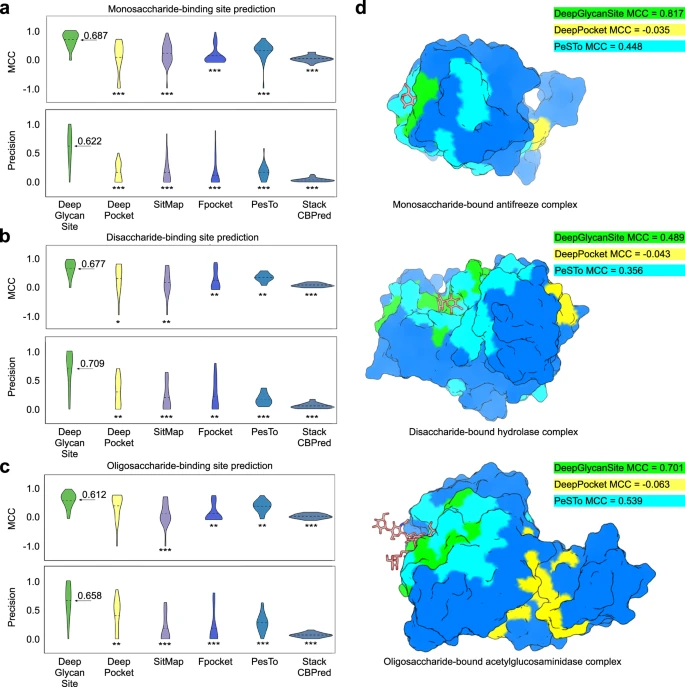 这些发现表明 DeepGlycanSite 对于糖结合位点预测具有重要价值,并可以深入了解具有治疗重要性蛋白质的糖类调节背后的分子机制。