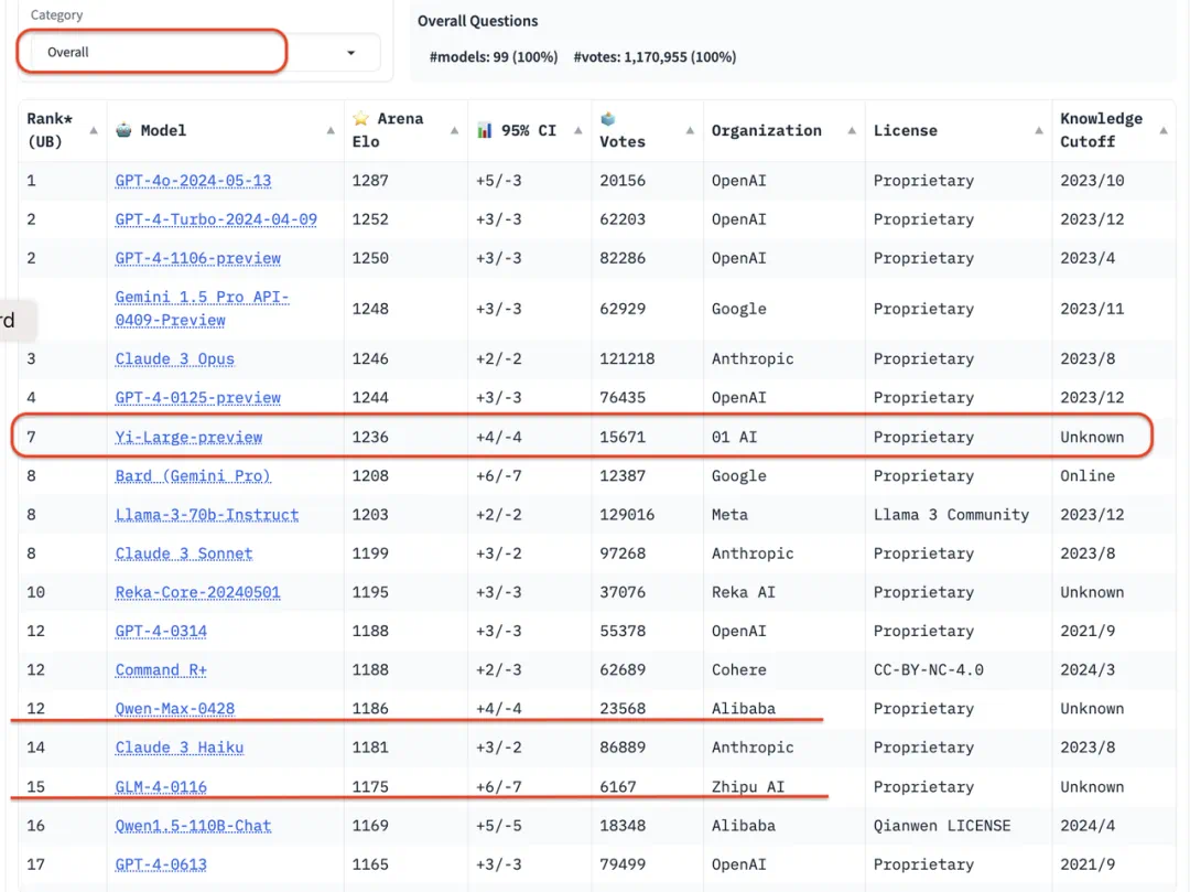 伯克利大学公开盲测 LMSYS 综合排名中,Yi-Large 在中国大模型中排名第一,在中文榜单上 Yi-Large 超过 GPT-4,与 GPT4o 并列排名世界第一(2024.6.25);斯坦福评测机构 AlpacaEval 2.0 经官方认证的模型排行榜上,Yi-Large 的 LC Win Rate 也高于 GPT-4(2024.6.25);在 GPQA、HumanEval、MT-Bench、AlignBench 等权威评测集上,Yi-Large 的得分也高于 GPT-4(2024.5.12)。