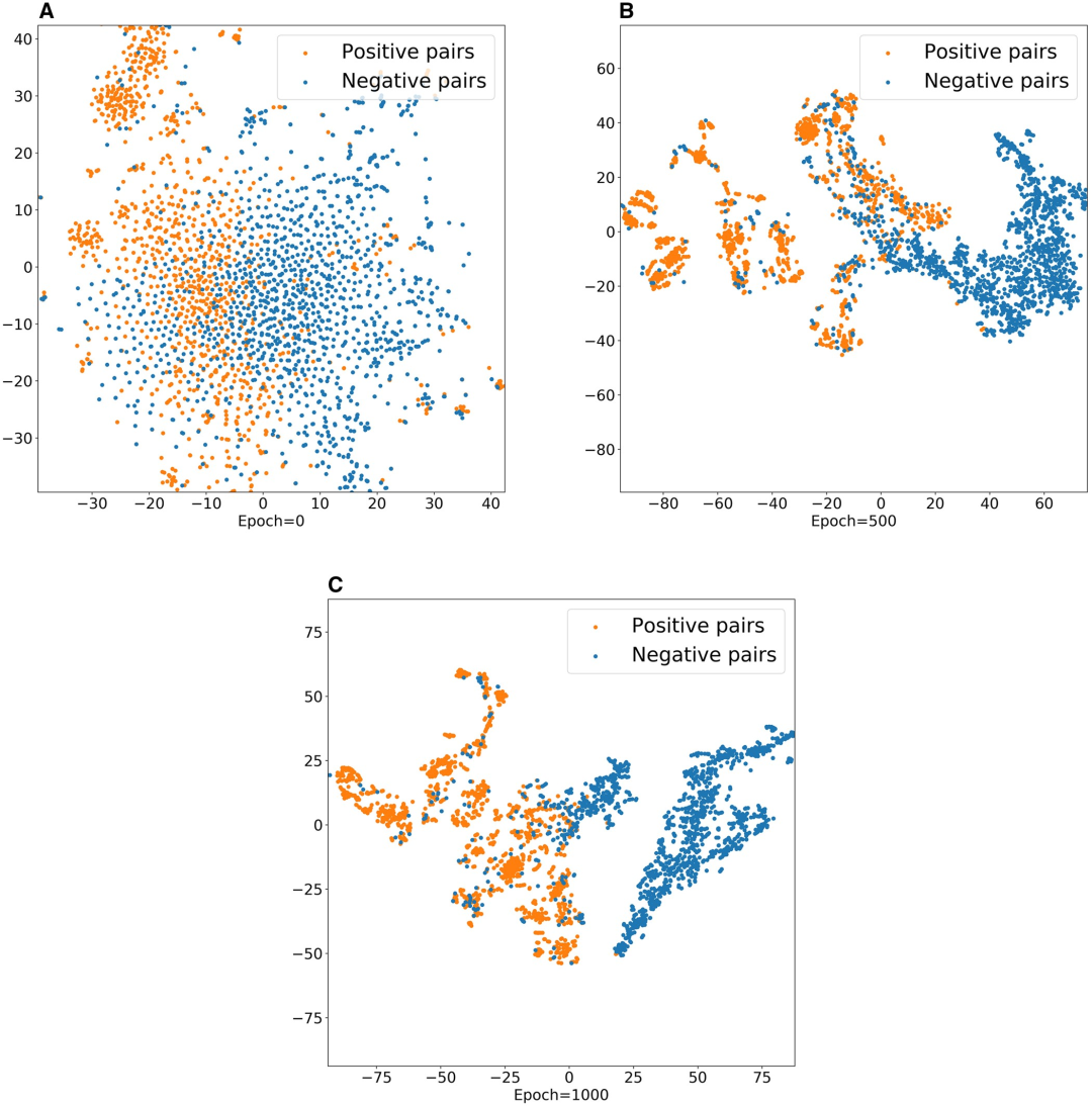 研究还展示了 MIDTI 学习到的药物-靶点嵌入的可视化结果,使用 t-SNE 工具将嵌入映射到二维空间。随着训练轮数的增加,正例和反例逐渐被区分开来,这证明了 MIDTI 所学习的嵌入具有良好的区分力和解释性,从而提高了 DTI 预测的准确性。