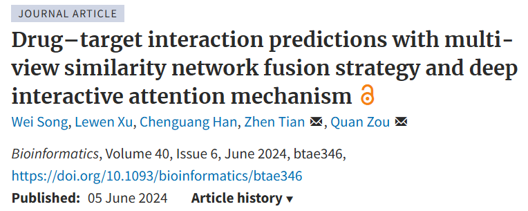 该研究以「Drug–target interaction predictions with multi-view similarity network fusion strategy and deep interactive attention mechanism」为题,于 2024 年 6 月 6 日发布在《Bioinformatics》。
