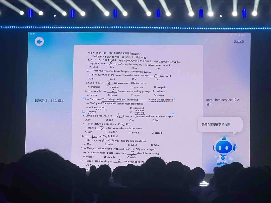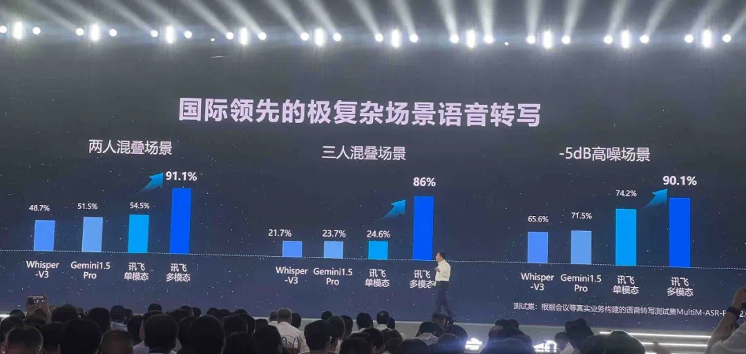 另外,讯飞还重点展示了其超复杂场景语音转写的能力。三位人员现场实测了在噪音场景下,同时混叠着说话,正常人耳已难以听清,只见讯飞星火的多模态能力不但实现了三人重叠语音的角色分离,还能实时转写出每个人说的话。