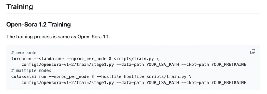 此外,继续深挖 Open-Sora 的网页,我们发现他们还提供了继续微调模型的代码指令。使用自己喜欢的类型的视频微调模型的话,就能让这个模型生成更符合我的审美要求的视频了!