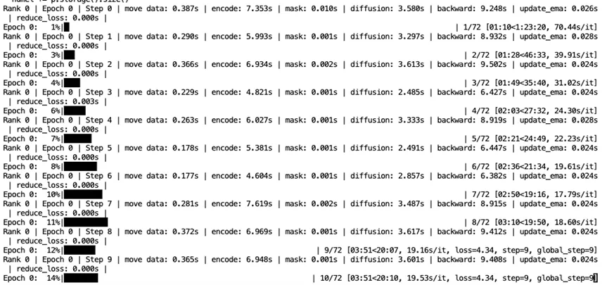 简单算一笔账,训练一步大约耗时约 20 秒,根据 Open-Sora 提供的数据,训练 70k 步(如下图所示),那他们耗时大约在 16 天左右,和他们文档中声称的 2 周左右相近(假设他们的所有机器各完成一个 step 的时间和我们这台机器相似)。
