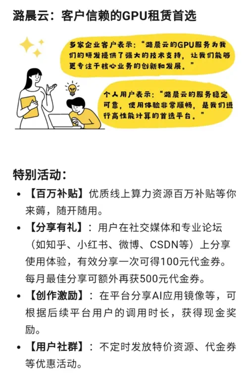 从潞晨云官方资料看到,用户在社交媒体和专业论坛(如知乎、小红书、微博、CSDN 等)上分享使用体验(带 #潞晨云或 @潞晨科技),有效分享一次可得 100 元代金券(有效期一周),换算成我们测评时生成的这种视频,相当于五六百个~