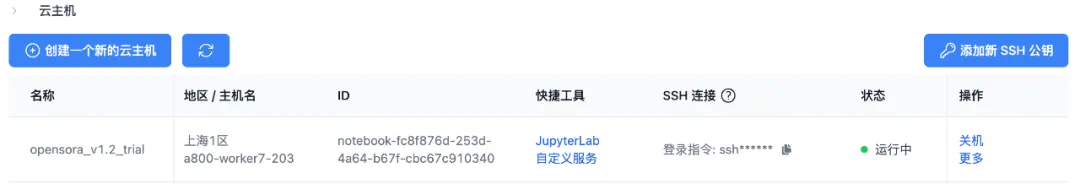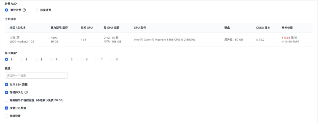 对于 Open-Sora 的推理,一张 A800 足够了,我们选择了 1 卡配置,并且允许了 SSH 连接、存储持久化,还挂载了公开数据(包括模型权重)。这些功能都不额外收费,还能提供更多便利,超级良心。