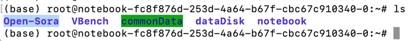 我们输入 ls,查看云主机的文件,可以看到 Open-Sora 这个文件夹就在初始路径处。