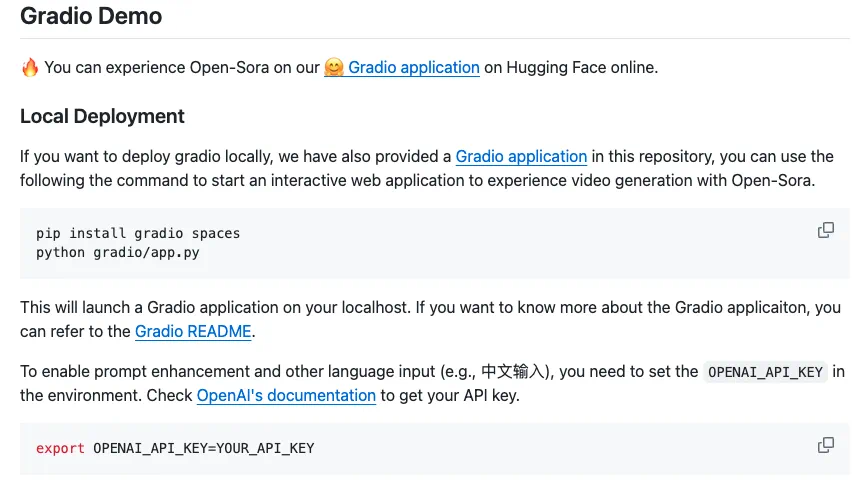 我们注意到,潞晨 Open-Sora 团队已经在 Github 中提供了将模型与 Gradio 适配的脚本,并且也提供了部署的命令行代码。然而,我们仍需要经历复杂的环境配置,才能成功运行部署代码。如果我们想完整体验 Open-Sora 的功能,尤其是生成长时间高分辨率(比如 720P 16 秒)的视频,更是需要性能好显存大的显卡(官方使用的是 H800)。Gradio 方案似乎没有提到如何解决这两个问题。