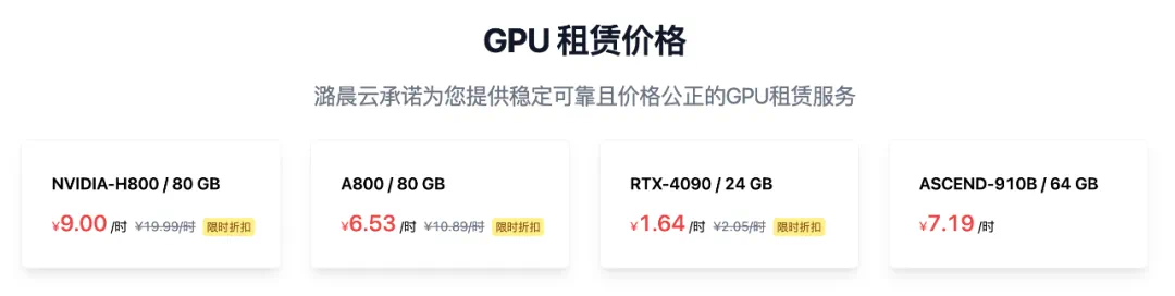 首先,潞晨云提供多类型的显卡,其中,A800 和 H800 这样的高端显卡也可以轻松租到。经我们测试,这种 80GB 显存的卡,单卡就可以满足 Open-Sora 项目的推理需求。