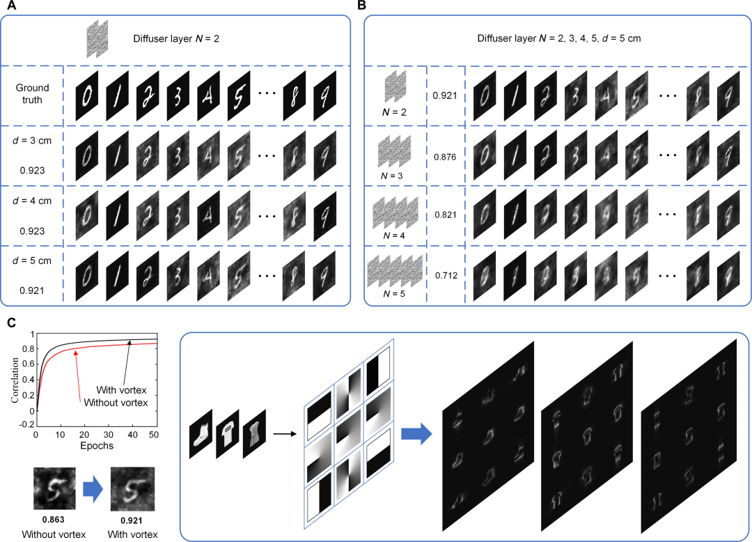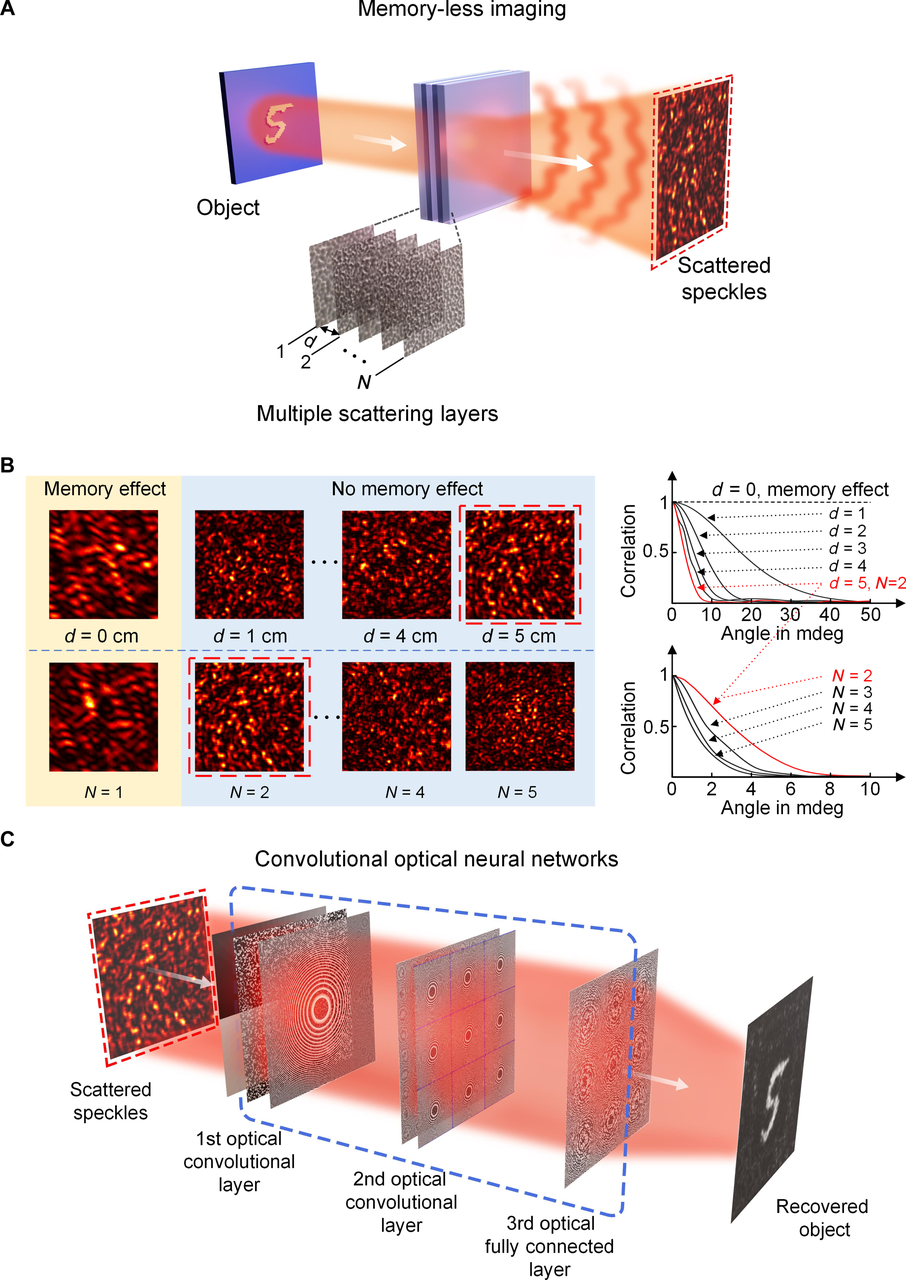 研究人员通过开发一个集成了多个以光速运行的并行内核的多级卷积光学神经网络 (ONN),展示了通过不存在光记忆效应的散射层进行图像重建。