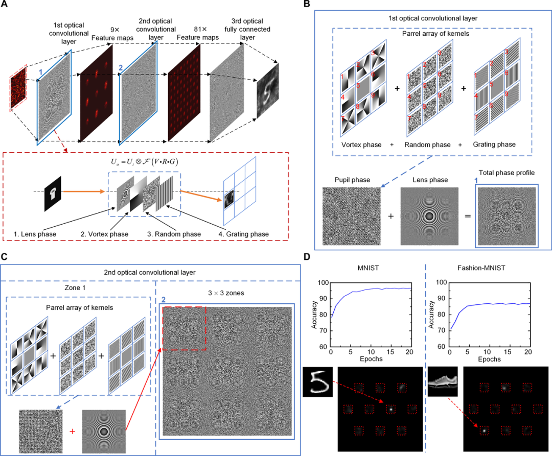 卷积 ONN 由一个光学输入层、两个卷积层和一个全连接输出层组成,可进行光速并行的一步计算。独特的是,并行多级光学卷积核采用涡旋和随机照明直接提取特征。该神经网络可通过强散射过程进行训练,使视野(Field of view)扩大 271 倍。