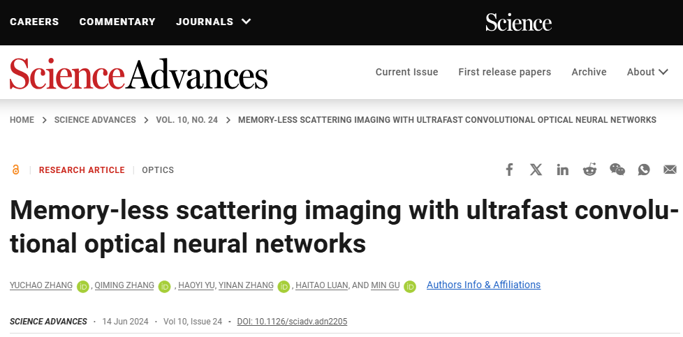 该研究以「Memory-less scattering imaging with ultrafast convolutional optical neural networks」为题,于 6 月 14 日发表在《Science Advances》杂志上。