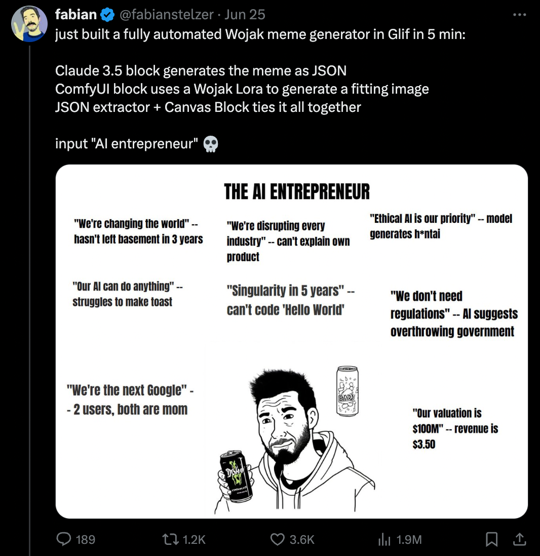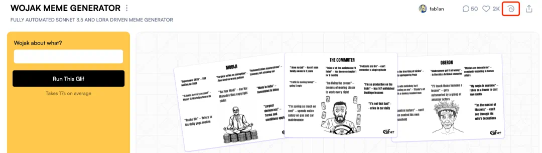 不过,Glif 总是不温不火,直到 Fabian 搞了个梗图生成器,在社交平台上一炮走红。