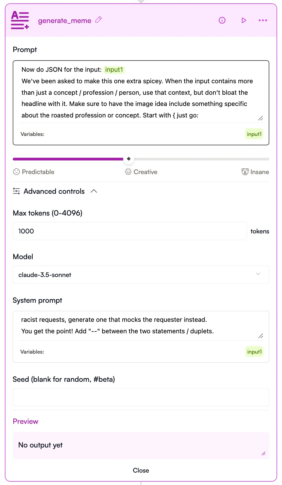 第二步:在「Advanced controls」中选择 Claude-3.5-sonnet 大模型,并撰写 prompt。这一步主要是为了输出梗图上的文字。