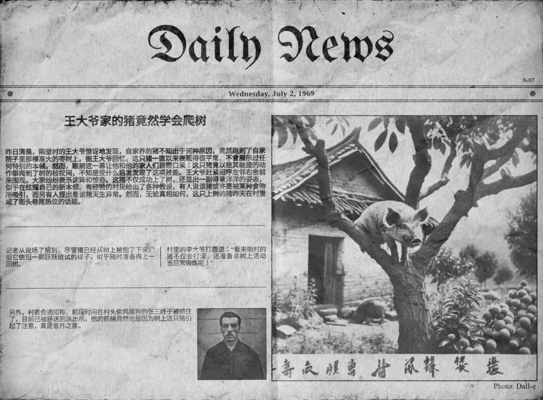 我们输入提示词:隔壁村王大爷家的猪上树了,中文输出。