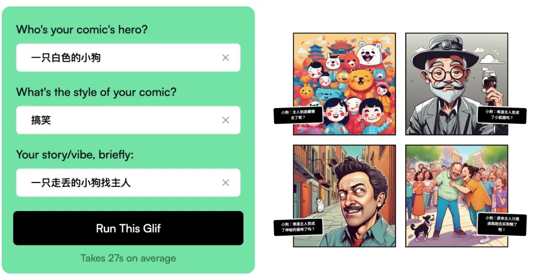 我们只需输入漫画主角、风格以及故事情节,它就能生成四格漫画。