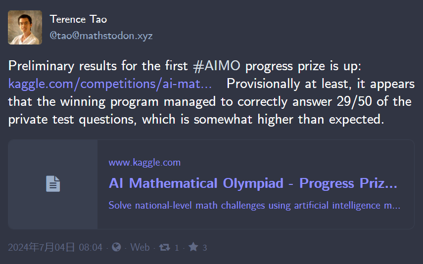 「AI 数学奥林匹克竞赛(AIMO 进步奖)的初步成绩已公布。根据排行榜的数据,目前看来,获胜的程序在私人测试中正确回答了 29/50 道题,这一成绩比预期的要高。」刚刚,陶哲轩在个人博客中公布了这一消息。