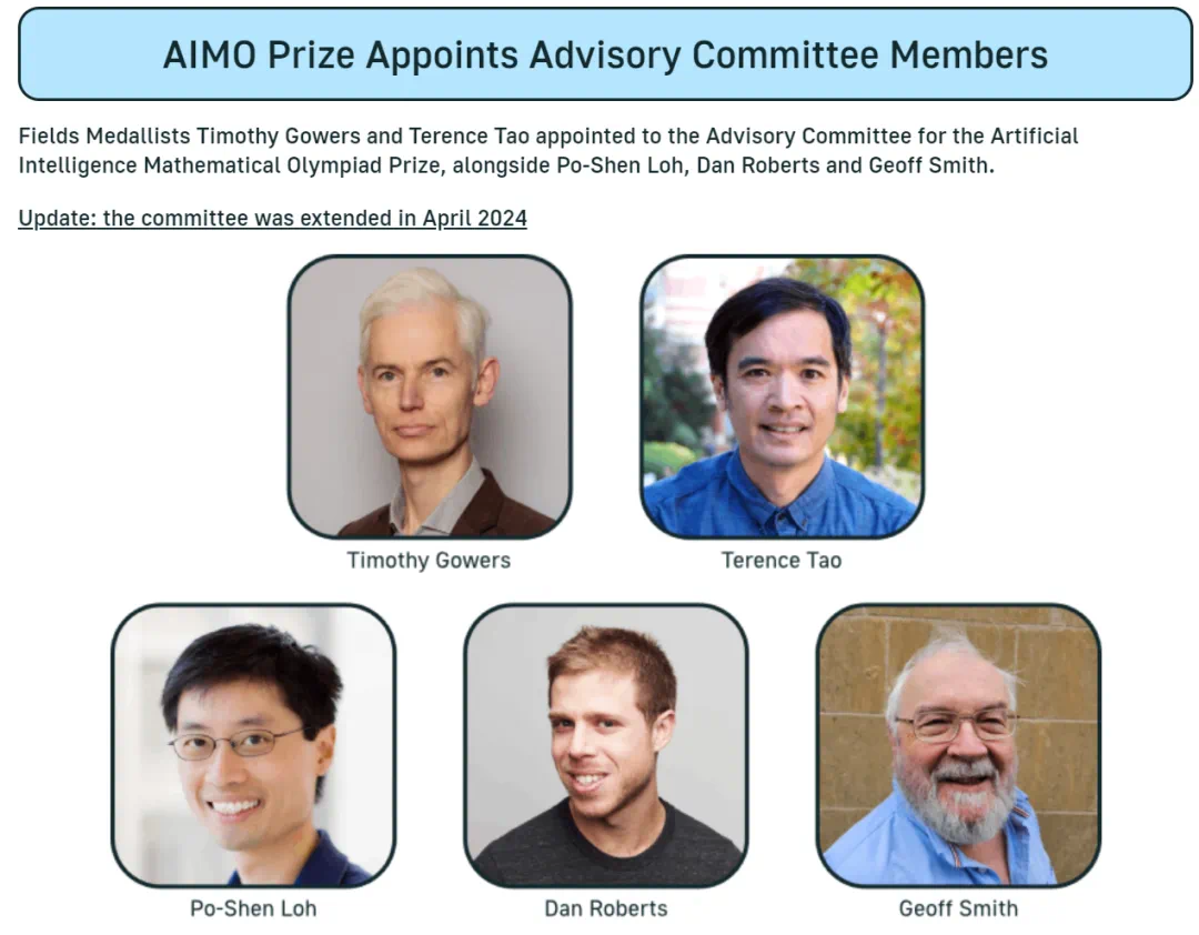 AIMO 顾问委员都是数学界的大牛,包括菲尔兹奖得主 Timothy Gowers 和陶哲轩(Terence Tao),与他们一同任职的还有 Po-Shen Loh、Dan Roberts 和 Geoff Smith。