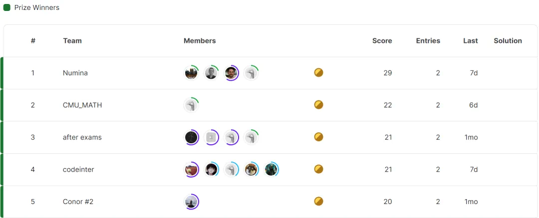 根据排名,我们可以看出,获得第一名的是 Numina 的团队,CMU_MATH 位列第二,after exams 暂居第三,codeinter、Conor #2 团队分别拿到第四、第五的成绩。
