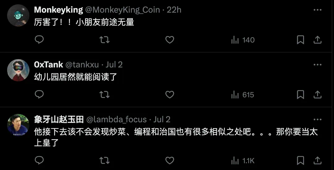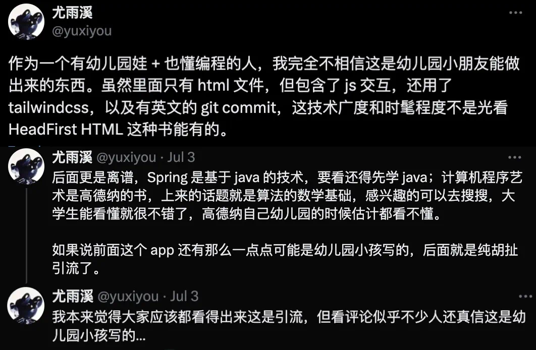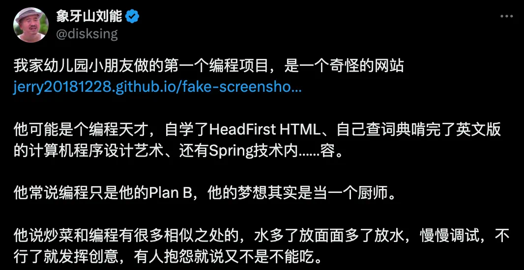 开发者 @disksing 发帖玩梗称,这是他家幼儿园小朋友做的第一个编程项目,并夸其是个编程天才,自学了 HeadFirst HTML、自己查词典啃完了英文版的计算机程序设计艺术、Spring 技术内容,还对炒菜和编程有一番心得,都是「水多了放面,面多了放水」。