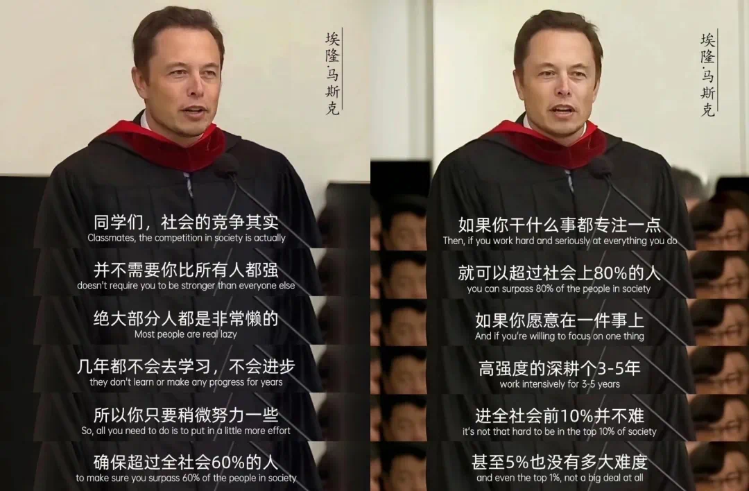 「同学们,社会的竞争其实并不需要你比所有人都强,绝大部分人都是非常懒的,几年都不会去学习,不会进步,所以你只要稍微努力一些,就能超过全社会 60% 的人;如果你干什么事都专注一点,就可以超过社会上 80% 的人;如果你愿意在一件事上高强度的深耕个 3-5 年,进全社会前 10% 并不难,甚至 5% 也没有多大难度。」