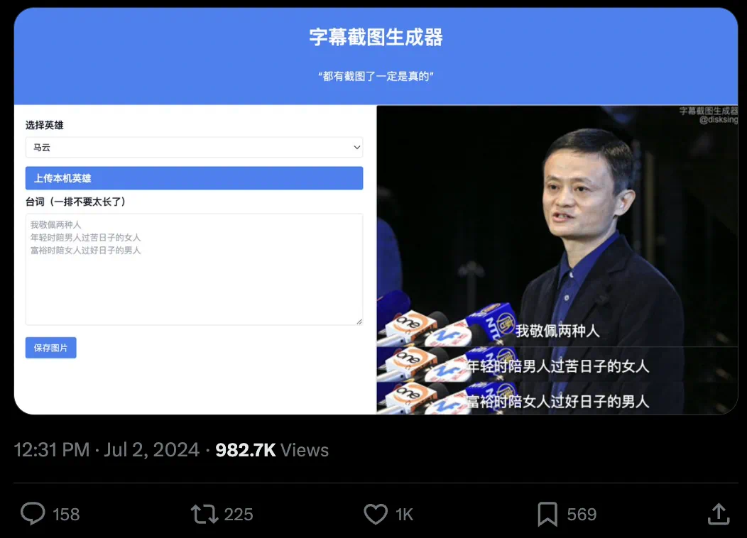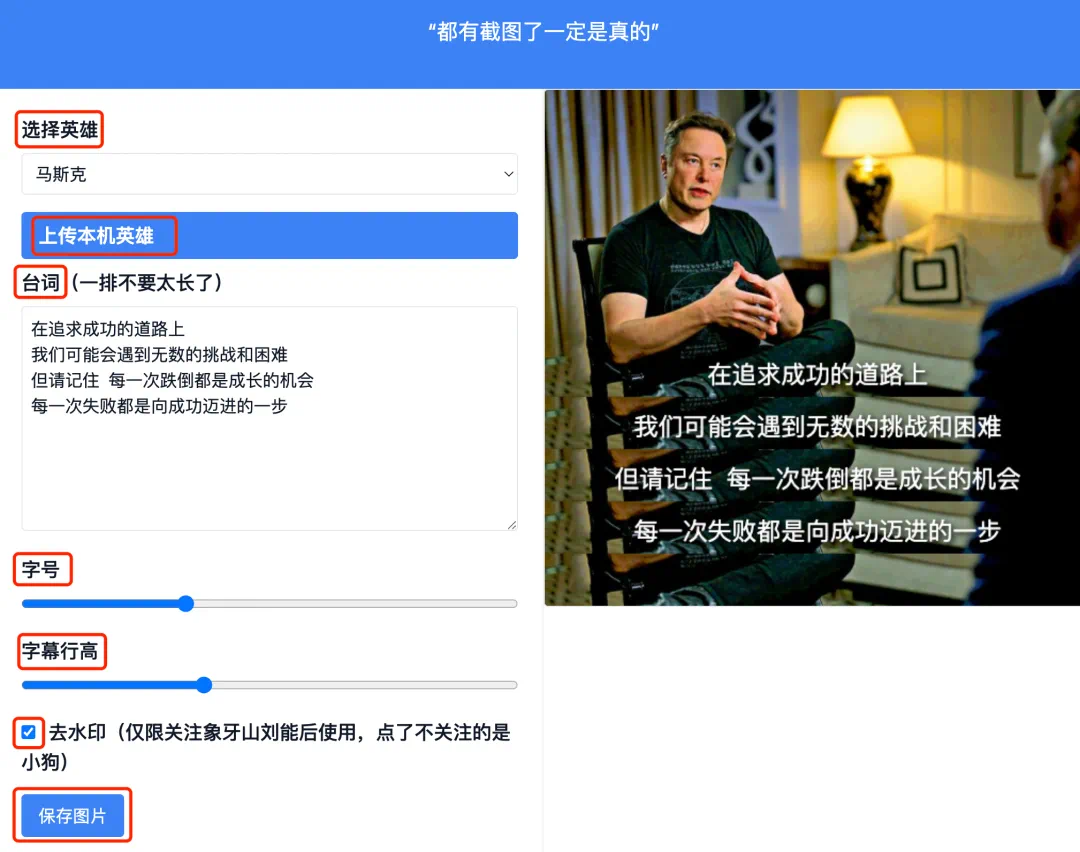 用户只需上传一张图片,再编上几句语录,就能生成一张名人名言或者电影台词的截图。