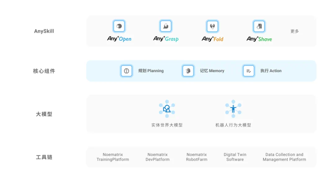 穹彻具身大脑具备全链路的具身智能技术框架。其中,穹彻自研的两个具身智能大模型:实体世界大模型和机器人行为大模型,可以看作此框架中的主要助推器,承担了推进操作物理常识和智能体行为决策的联合训练的重担。