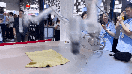 实体世界大模型能够通过训练来学习操作物理常识表征,并做到低成本可规模化地让穹彻具身大脑理解 “世界是什么”,本次大会上所展示的衣物折叠正是这一强大能力的具象呈现:在 AI 的世界里,对操作对象的本质理解会随着其自由度增加而提升,但柔性物体的自由度是无穷维的,因此可以基于衣物的任意初始状态完成折叠操作这一展示,成功体现了穹彻具身大脑对复杂物体操作的理解的顶级能力。调研表明,这也是全球第一次在公开展会上开放展示初始状态混乱的衣物折叠。