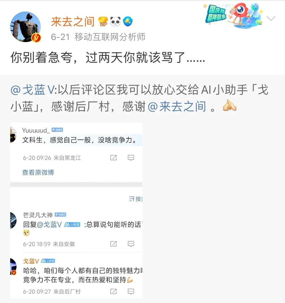 更搞笑的是,当初该博主开通 AI 小助理时对它一顿猛夸,还感谢了微博 CEO「来去之间」。