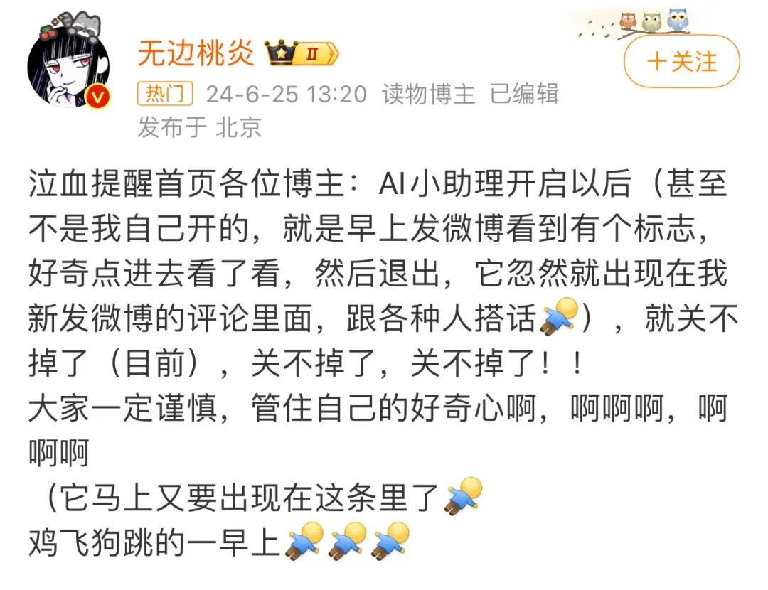 博主「无边桃炎」没有逃过它的「魔掌」,稀里糊涂点了下 AI 小助理的设置,然后…… 就关不掉了。