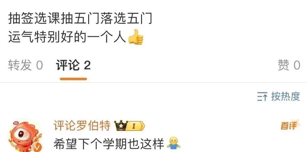 有网友抽签选课门门落选,评论罗伯特火上浇油,「希望下个学期也这样」。