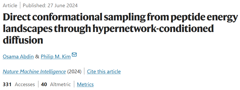 该研究以「Direct conformational sampling from peptide energy landscapes through hypernetwork-conditioned diffusion」为题,于 2024 年 6 月 27 日发布在《Nature Machine Intelligence》。