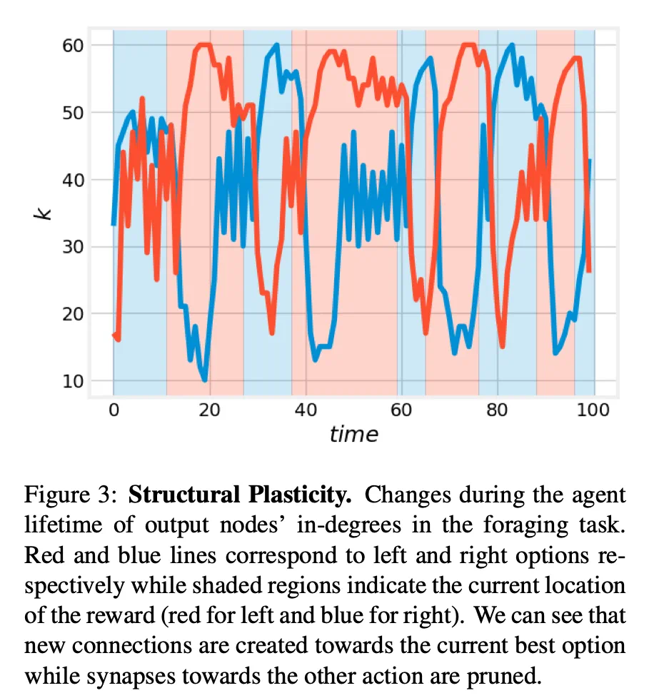 该研究还表明,在需要快速适应或具有非平稳动态、需要持续适应的环境中,结构可塑性能够改善结果。此外,该研究还展示了基于预环境自发性活动驱动的发展阶段在网络自组织形成功能单元方面的有效性。