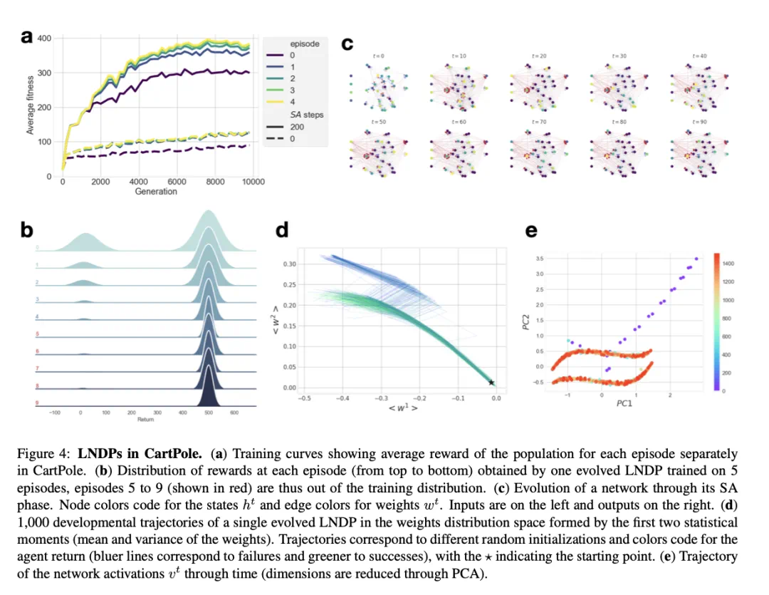 在 CartPole 环境中,对于没有 SA 的模型来说,在最开始就达到良好性能特别困难,而具有 SA 的模型在最初就显示出解决任务的固有技能。这展示出模型在非奖励依赖和自组织的方式下实现目标功能网络的能力。