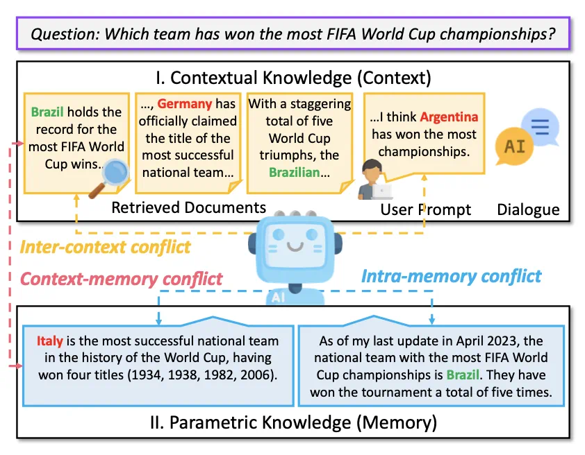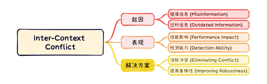 Inter-Context Conflict 即上下文知识内部的冲突。例子:通过 Web 检索,获得的信息因为发布的时间不同,或是混入了恶意的有误信息而自相冲突。