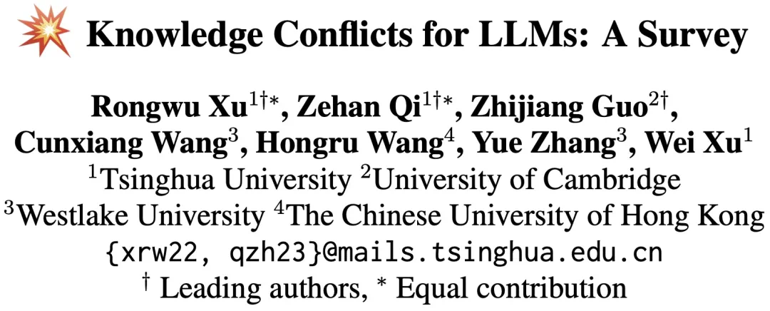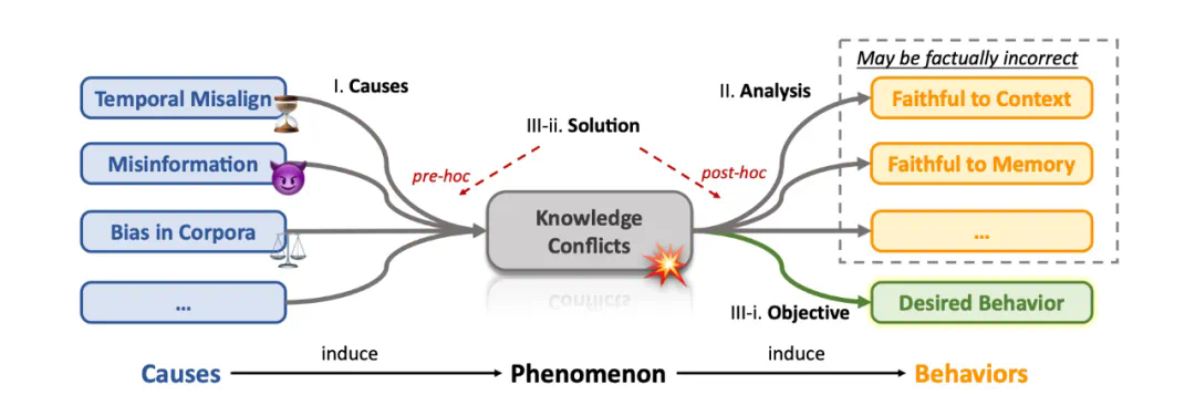 近期,来自清华大学、剑桥大学、西湖大学、香港中文大学的研究者联合发布了一篇综述,从起因、表现以及解决方案三个方面,对三种不同的知识冲突类型进行详细探讨,帮助读者更好地理解和应对这一挑战。在我们看来,知识冲突既是导致各种模型下游表现的原因,也是从知识自身和模型知识学习中天然复杂性中呈现出的效果。