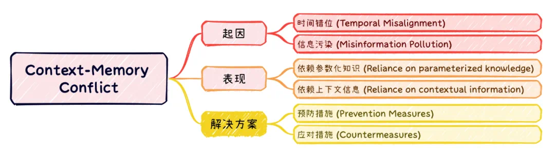 Context-Memory Conflict 的核心在于上下文信息与参数化知识之间的差异。这种冲突的起因主要分为两个方面:时间错位(Temporal Misalignment)和信息污染(Misinformation Pollution)。