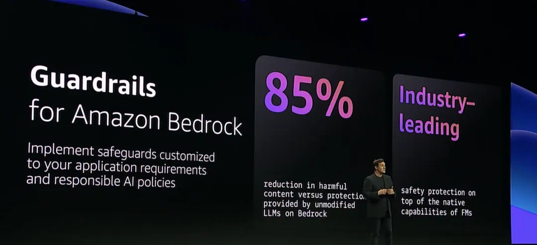 大模型除了好用、个性化,另一个人们关注的热点话题是「安全」。Amazon Bedrock 平台上的「Guardrails」正是为解决这一需求而设的。亚马逊云科技全球 AI 产品副总裁 Matt Wood 表示,Guardrails for Amazon Bedrock 可以阻止高达 85% 的有害内容。