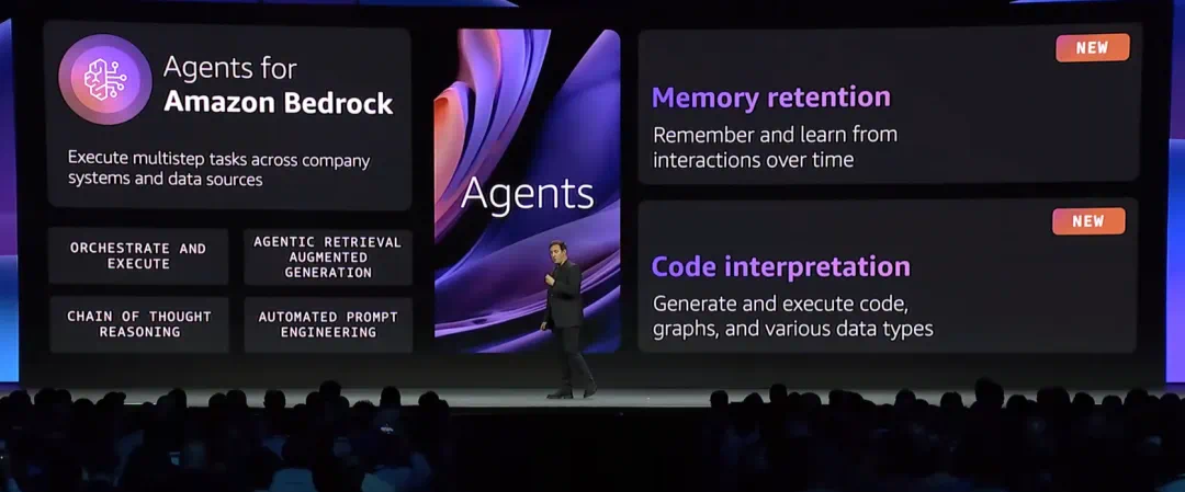最后还有智能体,Agents for Amazon Bedrock 能力也是本场峰会的焦点,它是生成式 AI 应用跨不同系统和数据源运行多步骤任务的关键。