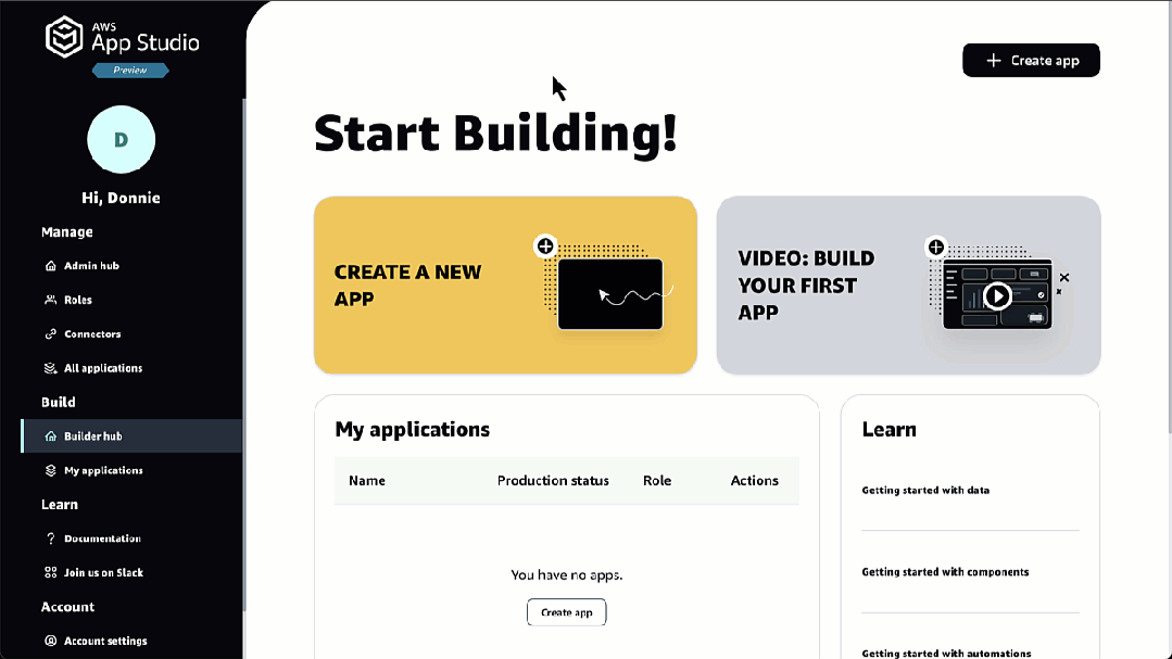 仅需要自然语言作为输入,Amazon App Studio 几分钟就能创建出一款企业级应用程序,省去了传统软件开发的绝大部分流程 —— 这在此前至少需要几天时间。某种意义上说,生成式 AI 技术让传统的「学习曲线」失效了,在真正的无代码工具面前,用户只需要提升自己的专业知识即可。