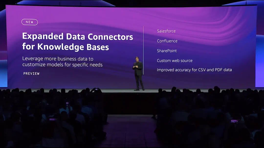 过去数月,亚马逊云科技持续向知识库加入嵌入模型、向量存储和基础模型。现在,知识库有了 Expanded Data Connectors(预览版)。除了 Amazon S3 对象存储服务之外,企业用户可以将自定义 web 域、Confluence、SharePoint、Salesforce 等作为数据源连接到 RAG 应用,从而可以提供更相关、更准确、更定制的响应。