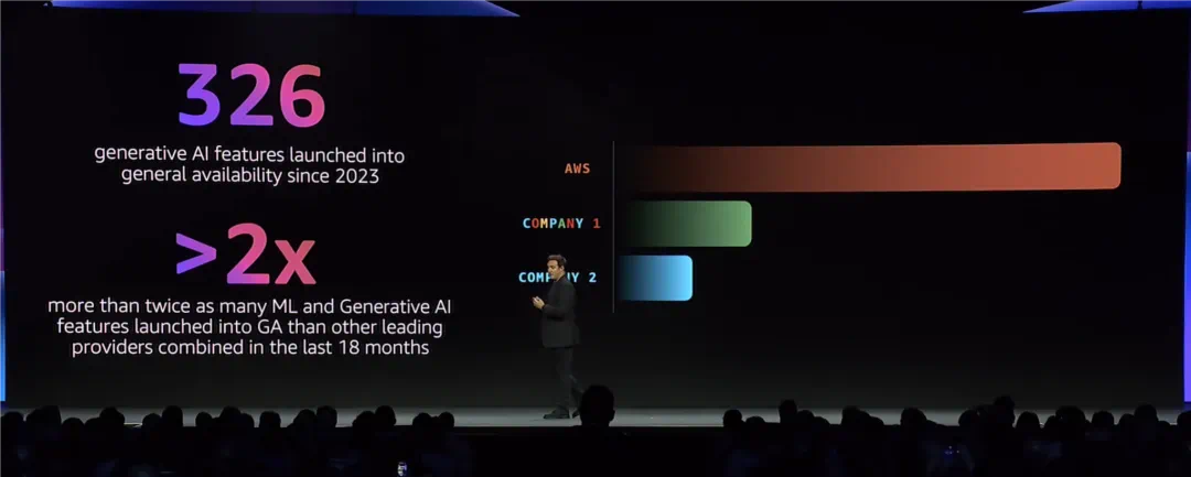 从 2023 年到现在,不到两年的时间里,亚马逊云科技已经发布了多达 326 个生成式 AI 功能。横向对比一下,过去十八个月,亚马逊云科技正式发布的机器学习和生成式 AI 功能的数量是其他主要供应商总和的两倍多,用一骑绝尘来形容也不为过。